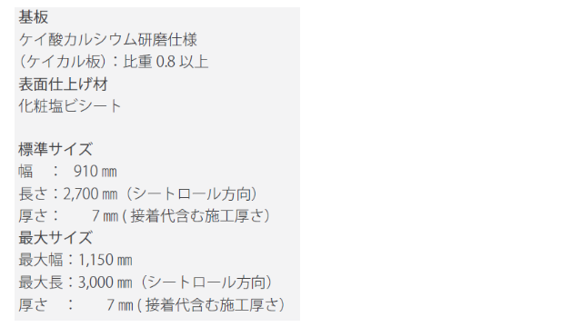 ※各メーカーの技術資料に基づき、平成12 年建設省告示第1400 号ならびに平成16 年国土交通省告示第1178 号による改正で例示された不燃材料です。基板は上記告示で定められた、厚さが5 ミリメートル以上の繊維混入けい酸カルシウム板に該当し、各メーカーの化粧塩ビシートにおける国土交通省の防火認定番号に準じます。
