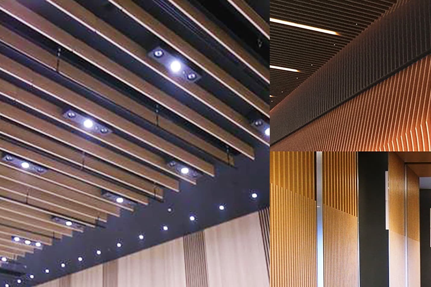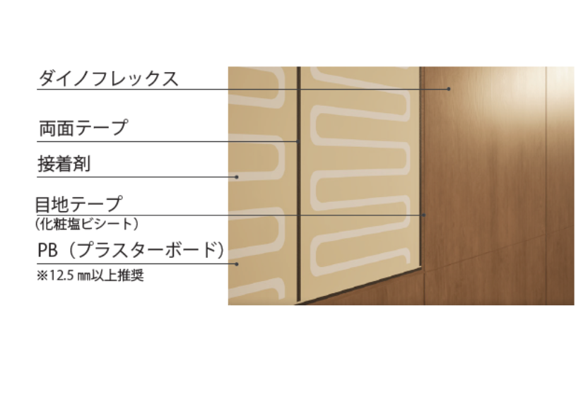 施工した際にパネルサイズ、下地の状態及び施工環境等により表面に不規則な陰影が生じる場合があります。また、化粧塩ビシートの柄によってはグレアを引き起こし、不陸が目立ちやすい場合があります。上記の環境での利用は十分ご留意ください。ダイノフレックスは表面の化粧塩ビシートの国土交通省防火認定番号、特性及び性能等は各メーカーの技術資料に基づきます。